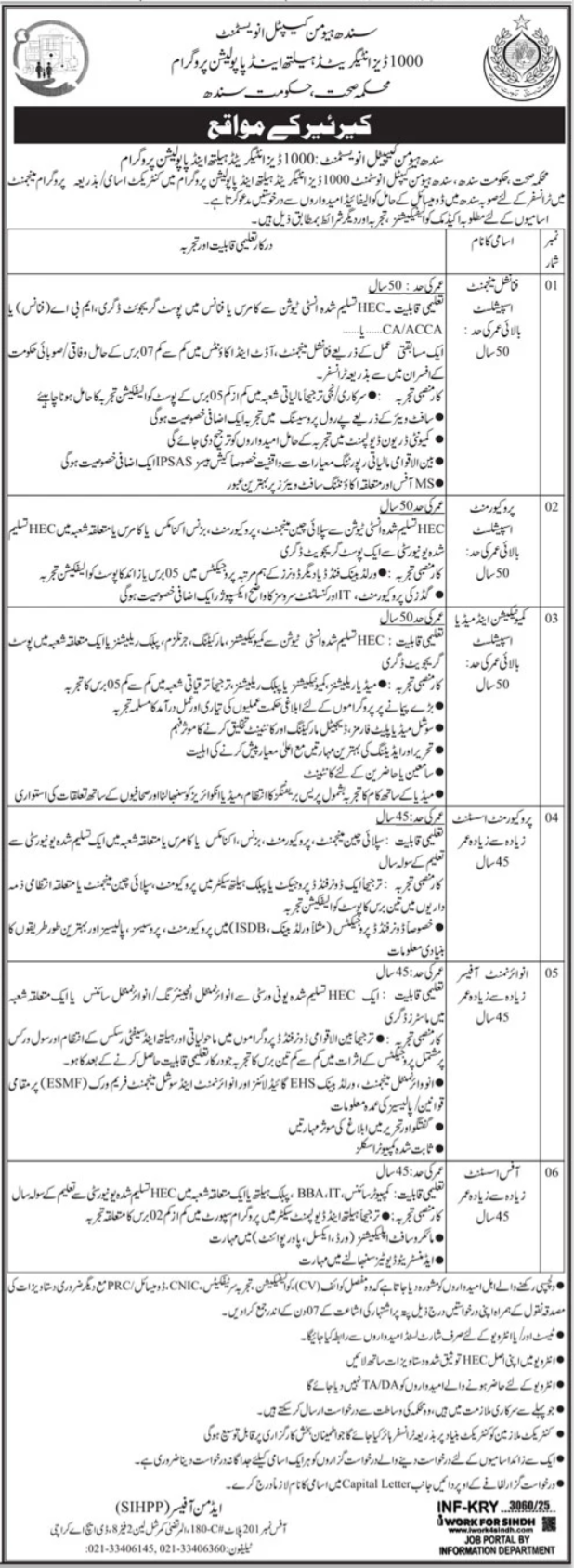 1000 Diseased Health & Population Program Sindh SIHPP Jobs announce the Contract career opportunities for the post of See Below Ad in Sindh, Karachi for the fresh and experienced candidates on Contract basis who have Check Advertisement degree. Posted date of this post is 02/10/2025 and the last date is 09/10/2025. if you are eligible for this job apply before due date.