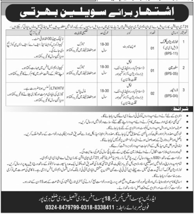 21 Army Aviation Squadron Haripur Jobs 2026 announce the Contract career opportunities for the post of See Below Ad in Khyber Pakhtunkhwa, Haripur for the fresh and experienced candidates on Contract basis who have Check Advertisement degree. Posted date of this post is 01/04/2026 and the last date is 16/04/2026. if you are eligible for this job apply before due date.