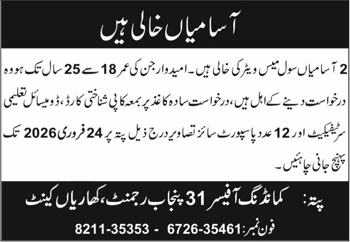 31 Punjab Regiment Kharian Cantt Job 2026 announce the Contract career opportunities for the post of See Below Ad in Punjab for the fresh and experienced candidates on Contract basis who have Check Advertisement degree. Posted date of this post is 27/01/2026 and the last date is 24/02/2026. if you are eligible for this job apply before due date.