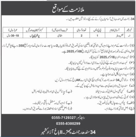 34 Regiment AJK Job 2025 announce the Contract career opportunities for the post of See Below Ad in Azad Jammu Kashmir, Muzaffarabad for the fresh and experienced candidates on Contract basis who have Check Advertisement degree. Posted date of this post is 02/12/2025 and the last date is 08/12/2025. if you are eligible for this job apply before due date.