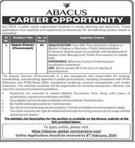 Abacus Global public sector Islamabad Company Jobs 2026 announce the Contract career opportunities for the post of See Below Ad in Federal, Islamabad for the fresh and experienced candidates on Contract basis who have Check Advertisement degree. Posted date of this post is 26/01/2026 and the last date is 08/02/2026. if you are eligible for this job apply before due date.