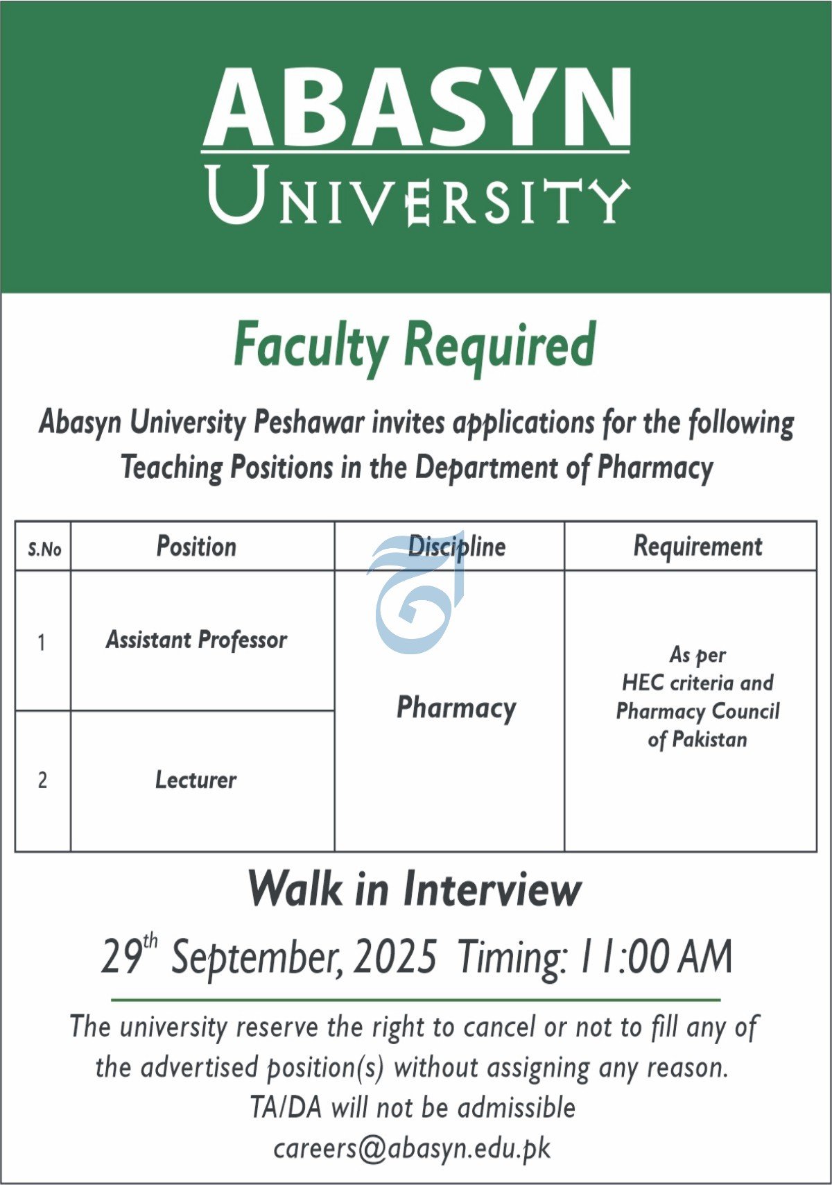 Faculty Required Abasyn University Peshawar invites applications for the following Teaching Positions in the Department of Pharmacy