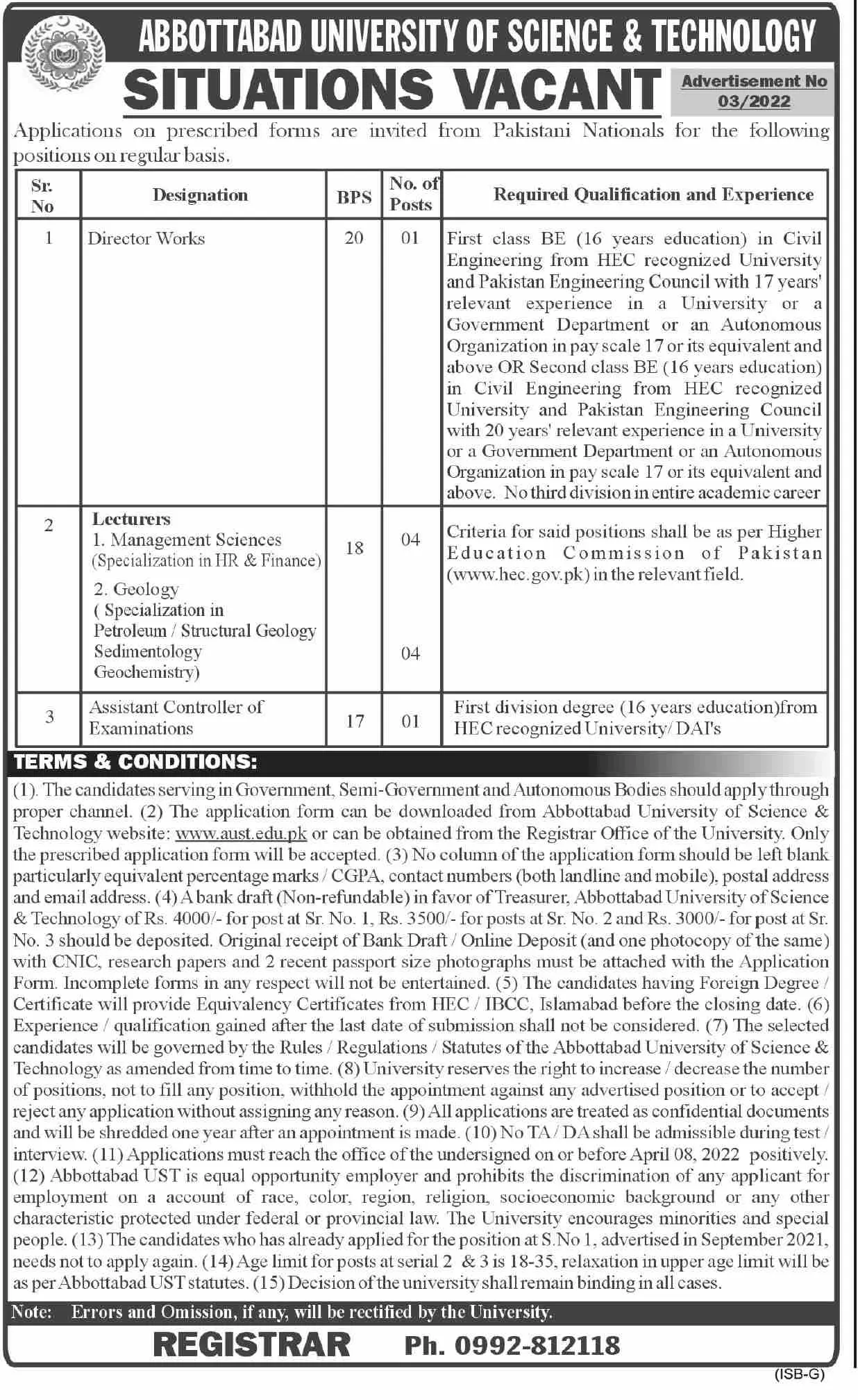 Abbottabad University of Science and Technology Jobs announce the Permanent career opportunities for the post of See Below Ad in Khyber Pakhtunkhwa,Abbottabad for the fresh and experienced candidates on Permanent basis who have Check Advertisement degree. Posted date of this post is 25/03/2022 and the last date is 08/04/2022. if you are eligible for this job apply before due date.