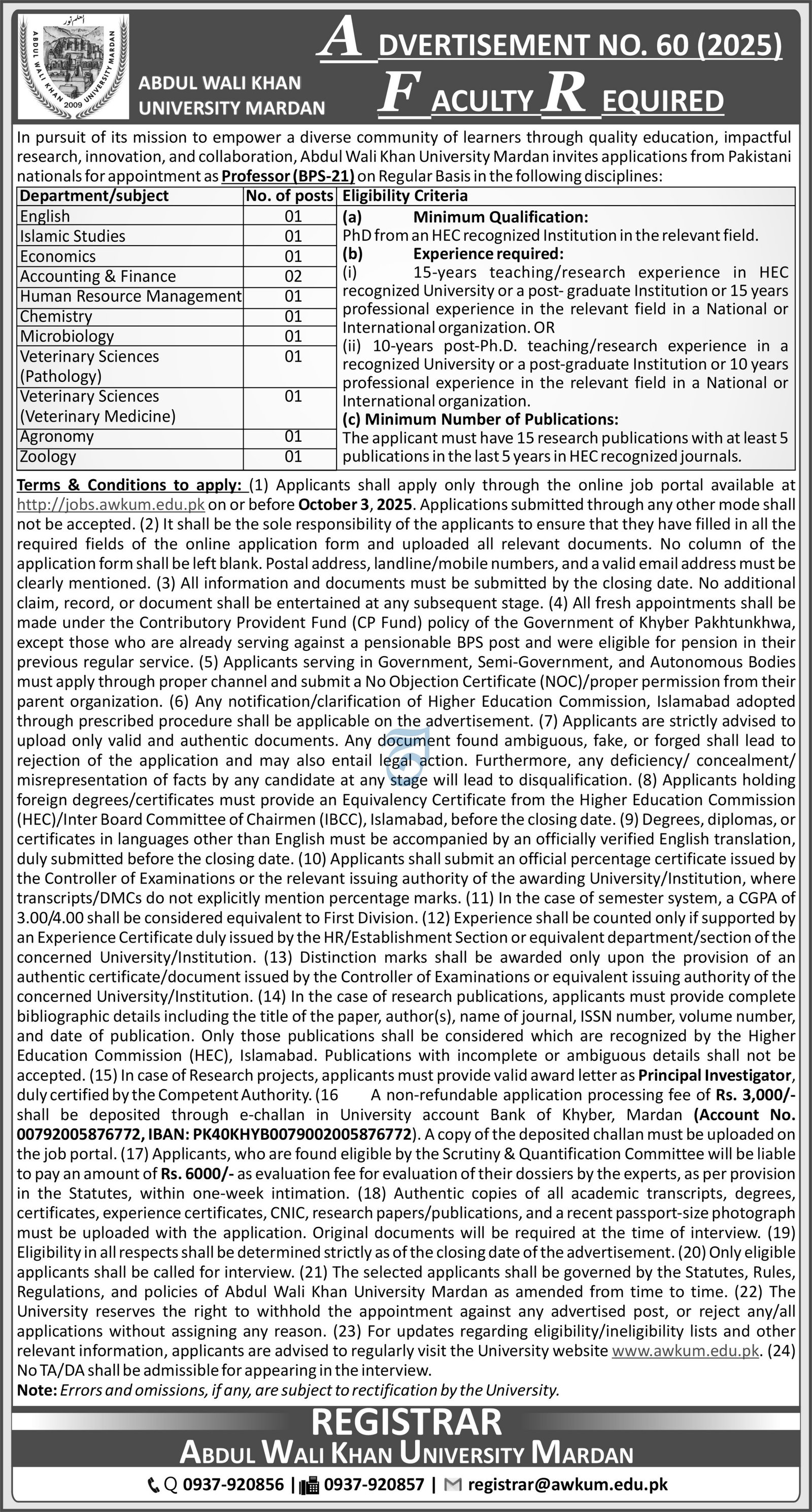 - Applicants shall apply only through the online job portal available at http://jobs.awkum.edu.pk on or before October 3, 2025. Applications submitted through any other mode shall not be accepted.