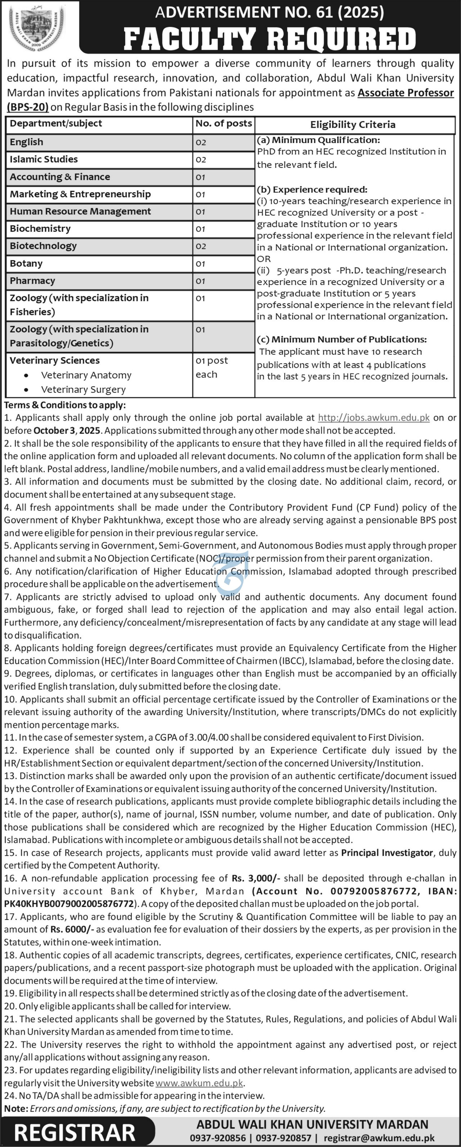 In pursuit of its mission to empower a diverse community of learners through quality education, impactful research, innovation, and collaboration, Abdul Wali Khan University Mardan invites applications from Pakistani nationals for appointment on the following faculty positions on Regular Basis in the following disciplines: