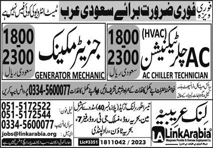 AC Technician And Generator Mechanic Jobs In Saudi Arabia announce the Contract career opportunities for the post of See Below Ad in Saudi Arabia for the fresh and experienced candidates on Contract basis who have Check Advertisement degree. Posted date of this post is 11/08/2023 and the last date is 11/09/2023. if you are eligible for this job apply before due date.