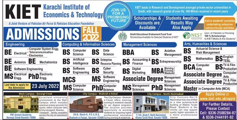 Last date to apply for KIET Karachi admission 2022 is 23 July, 2022