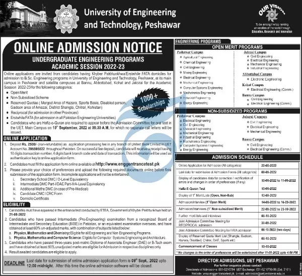 Admission in University of Engineering and technology announce the Contract career opportunities for the post of See Below Ad in Khyber Pakhtunkhwa, Peshawar for the fresh and experienced candidates on Contract basis who have Check Advertisement degree. Posted date of this post is 22/08/2022 and the last date is 09/09/2022. if you are eligible for this job apply before due date.