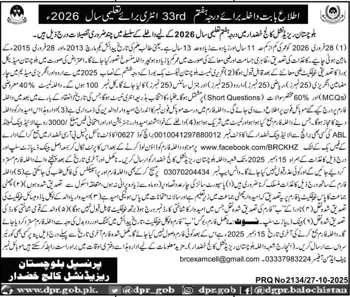 Balochistan Residential College (BRC) Khuzdar Balochistan announce the latest in different programs, details are mentioned in See Below Ad . Students from Balochistan, Khuzdar and other provinces of Pakistan, can apply for the . Students awaiting for the s in Balochistan Residential College (BRC) Khuzdar Balochistan can apply according the given criteria which is mentioned in the advertisement. Students awaiting results may also apply. Advertisement date is 28/10/2025 and the last date of the admission is 15/12/2025