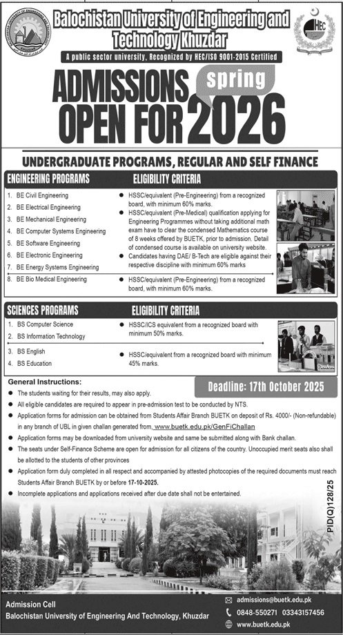 Balochistan University of Engineering and Technology BUETK Khuzdar announce the latest in different programs, details are mentioned in See Below Ad . Students from Balochistan, Khuzdar and other provinces of Pakistan, can apply for the . Students awaiting for the s in Balochistan University of Engineering and Technology BUETK Khuzdar can apply according the given criteria which is mentioned in the advertisement. Students awaiting results may also apply. Advertisement date is 05/09/2025 and the last date of the admission is 17/10/2025