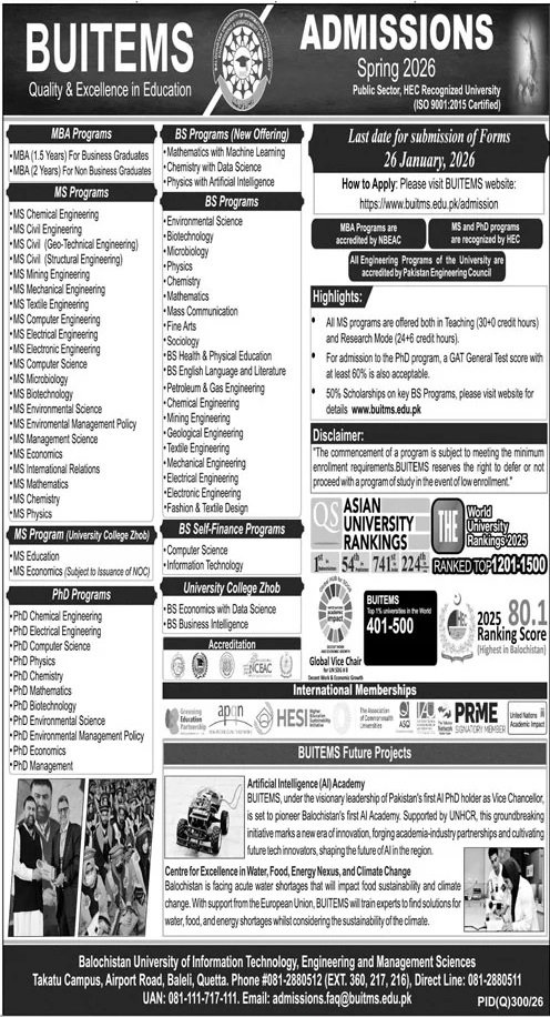 Balochistan University of Information Technology & Management Science Quetta announce the latest in different programs, details are mentioned in See Below Ad . Students from Balochistan, Quetta and other provinces of Pakistan, can apply for the . Students awaiting for the s in Balochistan University of Information Technology & Management Science Quetta can apply according the given criteria which is mentioned in the advertisement. Students awaiting results may also apply. Advertisement date is 15/01/2026 and the last date of the admission is 26/01/2026