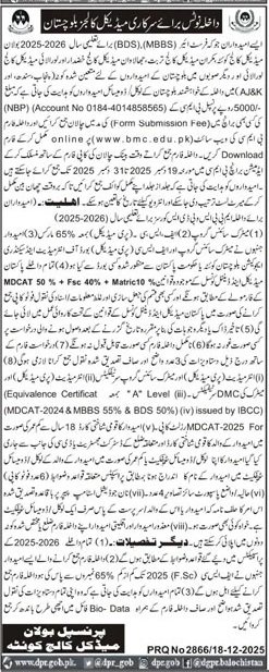 Bolan Medical College Quetta announce the latest Admission in different programs, details are mentioned in See Below Ad . Students from Balochistan, Quetta and other provinces of Pakistan, can apply for the Admission. Students awaiting for the Admissions in Bolan Medical College Quetta can apply according the given criteria which is mentioned in the advertisement. Students awaiting results may also apply. Advertisement date is 19/12/2025 and the last date of the admission is 31/12/2025