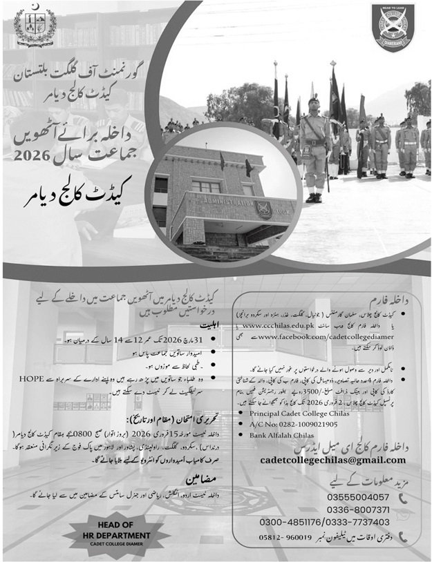 Government of Gilgit-Baltistan announce the latest in different programs, details are mentioned in See Below Ad . Students from Gilgit Baltistan, Gilgit and other provinces of Pakistan, can apply for the . Students awaiting for the s in Government of Gilgit-Baltistan can apply according the given criteria which is mentioned in the advertisement. Students awaiting results may also apply. Advertisement date is 30/11/2025 and the last date of the admission is 02/02/2026