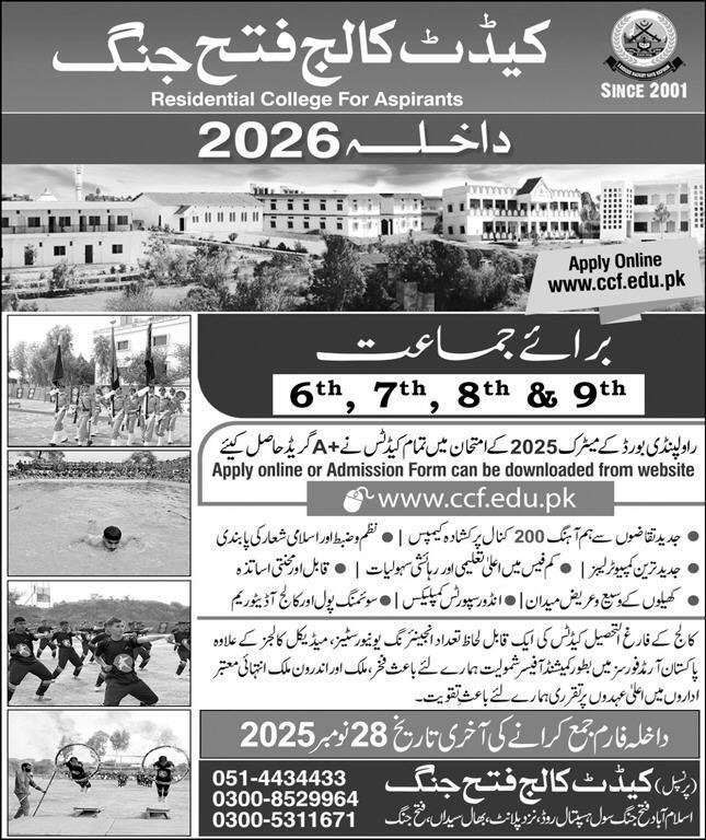 Cadet College Fateh Jang announce the latest in different programs, details are mentioned in See Below Ad . Students from Punjab and other provinces of Pakistan, can apply for the . Students awaiting for the s in Cadet College Fateh Jang can apply according the given criteria which is mentioned in the advertisement. Students awaiting results may also apply. Advertisement date is 16/11/2025 and the last date of the admission is 28/11/2025