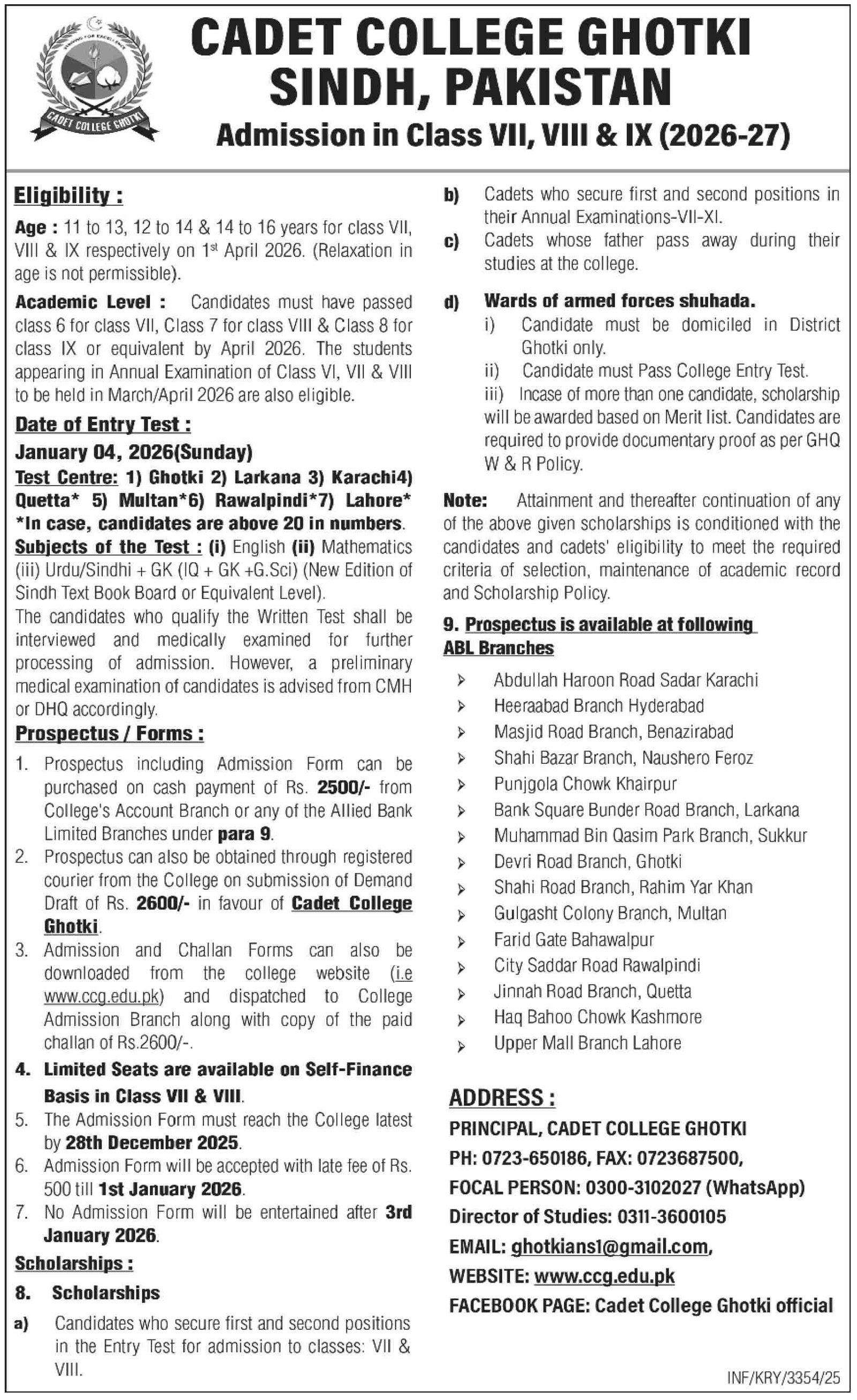 Admission Open in Cadet College Ghotki Sindh 2025 announce the Contract career opportunities for the post of See Below Ad in Sindh, Karachi for the fresh and experienced candidates on Contract basis who have Check Advertisement degree. Posted date of this post is 26/10/2025 and the last date is 28/12/2025. if you are eligible for this job apply before due date.