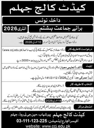 Cadet College Jhelum Punjab announce the latest in different programs, details are mentioned in See Below Ad . Students from Punjab, Jhelum and other provinces of Pakistan, can apply for the . Students awaiting for the s in Cadet College Jhelum Punjab can apply according the given criteria which is mentioned in the advertisement. Students awaiting results may also apply. Advertisement date is 07/12/2025 and the last date of the admission is 18/01/2026