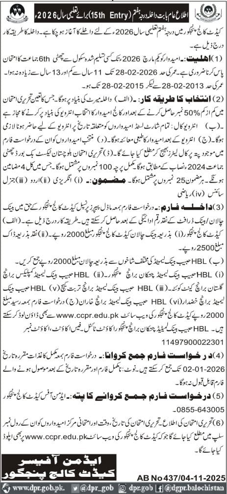 Cadet College Panjgur announce the latest in different programs, details are mentioned in See Below Ad . Students from Balochistan, Panjgoor and other provinces of Pakistan, can apply for the . Students awaiting for the s in Cadet College Panjgur can apply according the given criteria which is mentioned in the advertisement. Students awaiting results may also apply. Advertisement date is 05/11/2025 and the last date of the admission is 02/01/2026