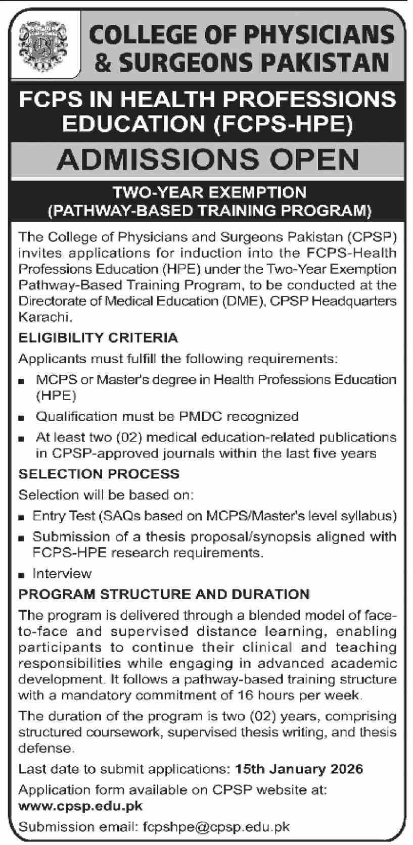 Admission Open in College of Physicians And Surgens 2026 announce the Contract career opportunities for the post of See Below Ad in Punjab, Rawalpindi for the fresh and experienced candidates on Contract basis who have Check Advertisement degree. Posted date of this post is 04/01/2026 and the last date is 15/01/2026. if you are eligible for this job apply before due date.