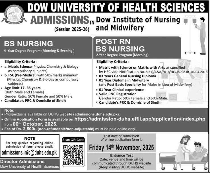 Admission Open in Dow University of Health Sciences 2025 announce the Contract career opportunities for the post of See Below Ad in Sindh, Karachi for the fresh and experienced candidates on Contract basis who have Check Advertisement degree. Posted date of this post is 05/10/2025 and the last date is 24/11/2025. if you are eligible for this job apply before due date.
