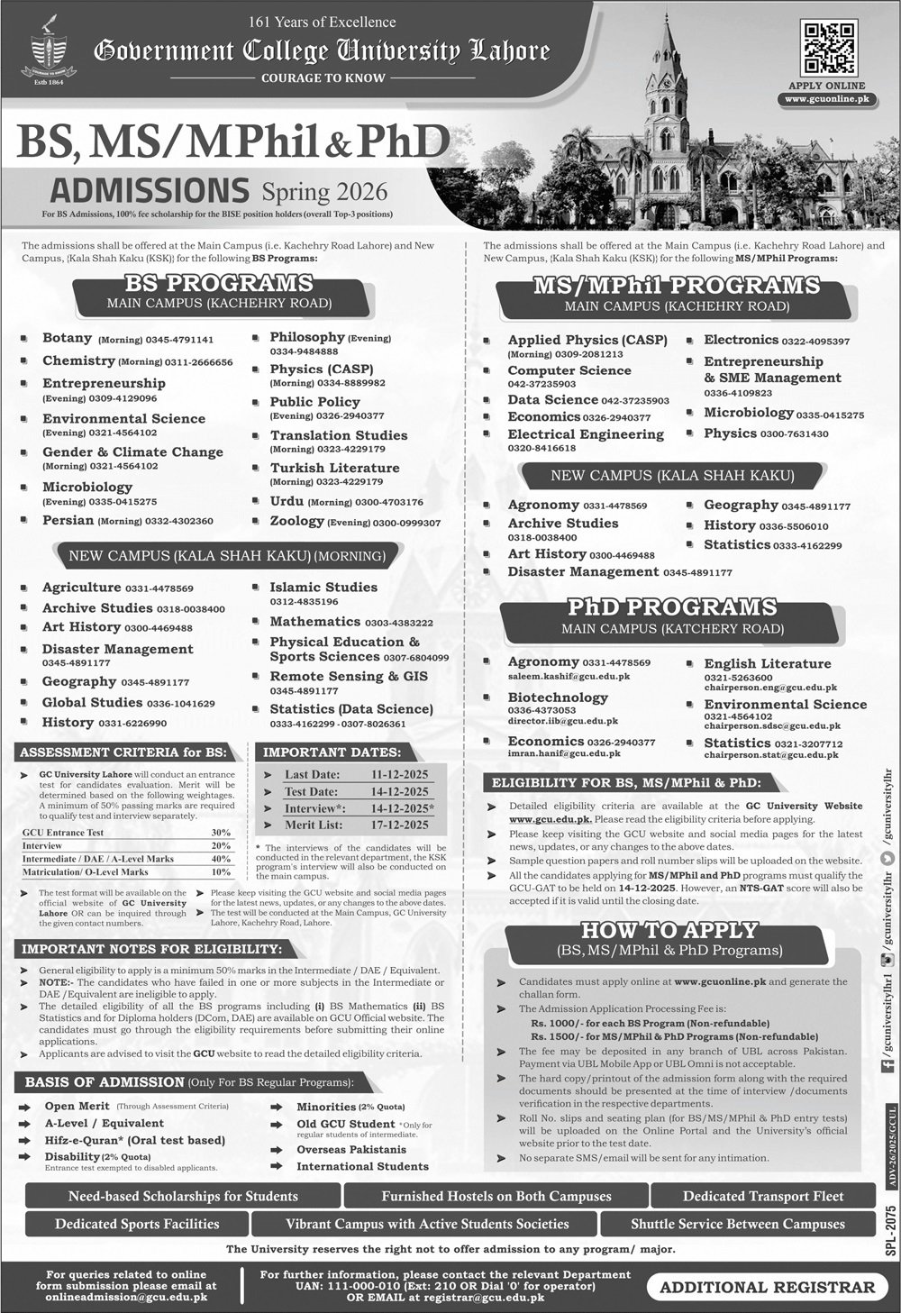 Admission Open in Government College University Lahore 2025 announce the Contract career opportunities for the post of See Below Ad in Punjab, Lahore for the fresh and experienced candidates on Contract basis who have Check Advertisement degree. Posted date of this post is 25/11/2025 and the last date is 14/12/2025. if you are eligible for this job apply before due date.
