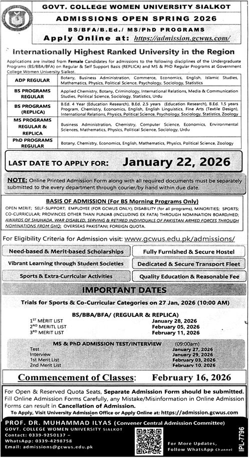 Govt College university Faisalabad announce the latest in different programs, details are mentioned in See Below Ad . Students from Punjab, Sialkot and other provinces of Pakistan, can apply for the . Students awaiting for the s in Govt College university Faisalabad can apply according the given criteria which is mentioned in the advertisement. Students awaiting results may also apply. Advertisement date is 21/12/2025 and the last date of the admission is 22/01/2026
