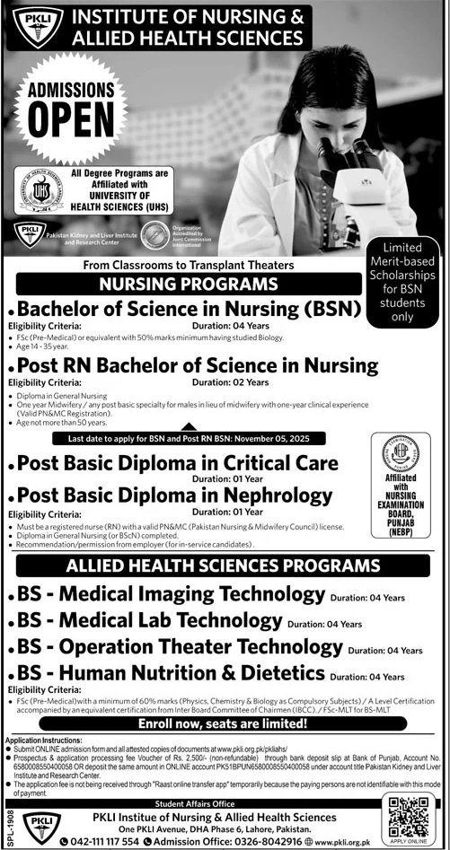 Subhan Institute of Nursing & Allied Health Sciences announce the latest in different programs, details are mentioned in See Below Ad . Students from Punjab, Lahore and other provinces of Pakistan, can apply for the . Students awaiting for the s in Subhan Institute of Nursing & Allied Health Sciences can apply according the given criteria which is mentioned in the advertisement. Students awaiting results may also apply. Advertisement date is 26/10/2025 and the last date of the admission is 31/10/2025