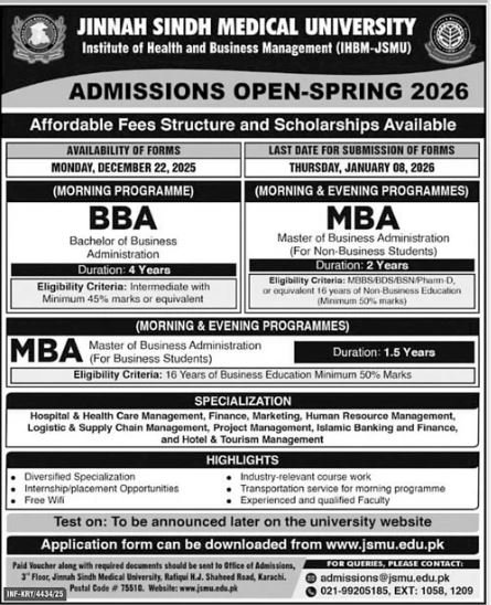 Jinnah Sindh Medical University Karachi announce the latest Admission in different programs, details are mentioned in See Below Ad . Students from Sindh, Karachi and other provinces of Pakistan, can apply for the Admission. Students awaiting for the Admissions in Jinnah Sindh Medical University Karachi can apply according the given criteria which is mentioned in the advertisement. Students awaiting results may also apply. Advertisement date is 21/12/2025 and the last date of the admission is 08/01/2026