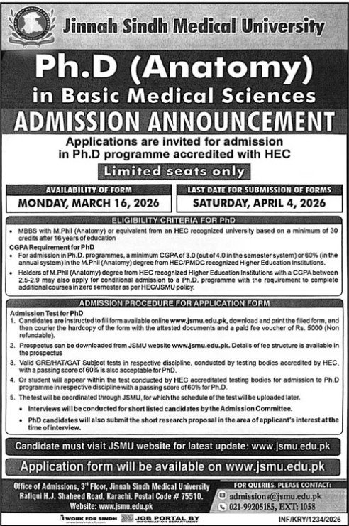 Jinnah Sindh Medical University Karachi announce the latest Admission in different programs, details are mentioned in See Below Ad. Students from Sindh,Karachi and other provinces of Pakistan, can apply for the Admission. Students awaiting for the Admissions in Jinnah Sindh Medical University Karachi can apply according the given criteria which is mentioned in the advertisement. Students awaiting results may also apply. Advertisement date is 29/03/2026 and the last date of the admission is 04/04/2026