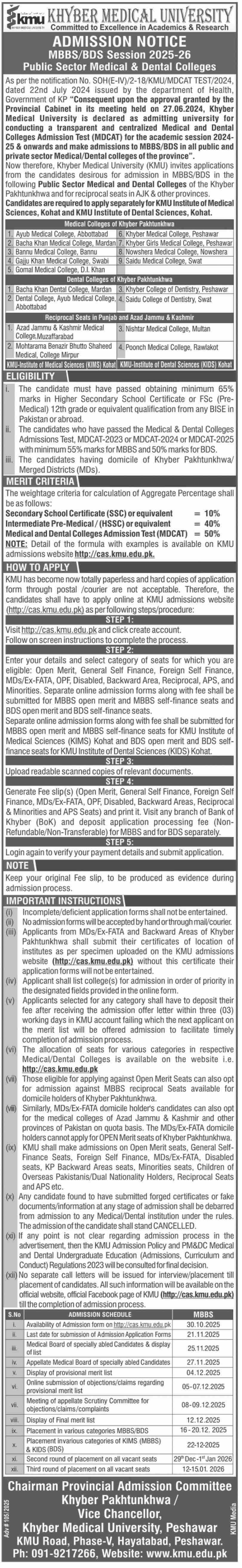 Khyber Medical University Peshawar announce the latest in different programs, details are mentioned in See Below Ad . Students from Khyber Pakhtunkhwa, Peshawar and other provinces of Pakistan, can apply for the . Students awaiting for the s in Khyber Medical University Peshawar can apply according the given criteria which is mentioned in the advertisement. Students awaiting results may also apply. Advertisement date is 29/10/2025 and the last date of the admission is 21/11/2025