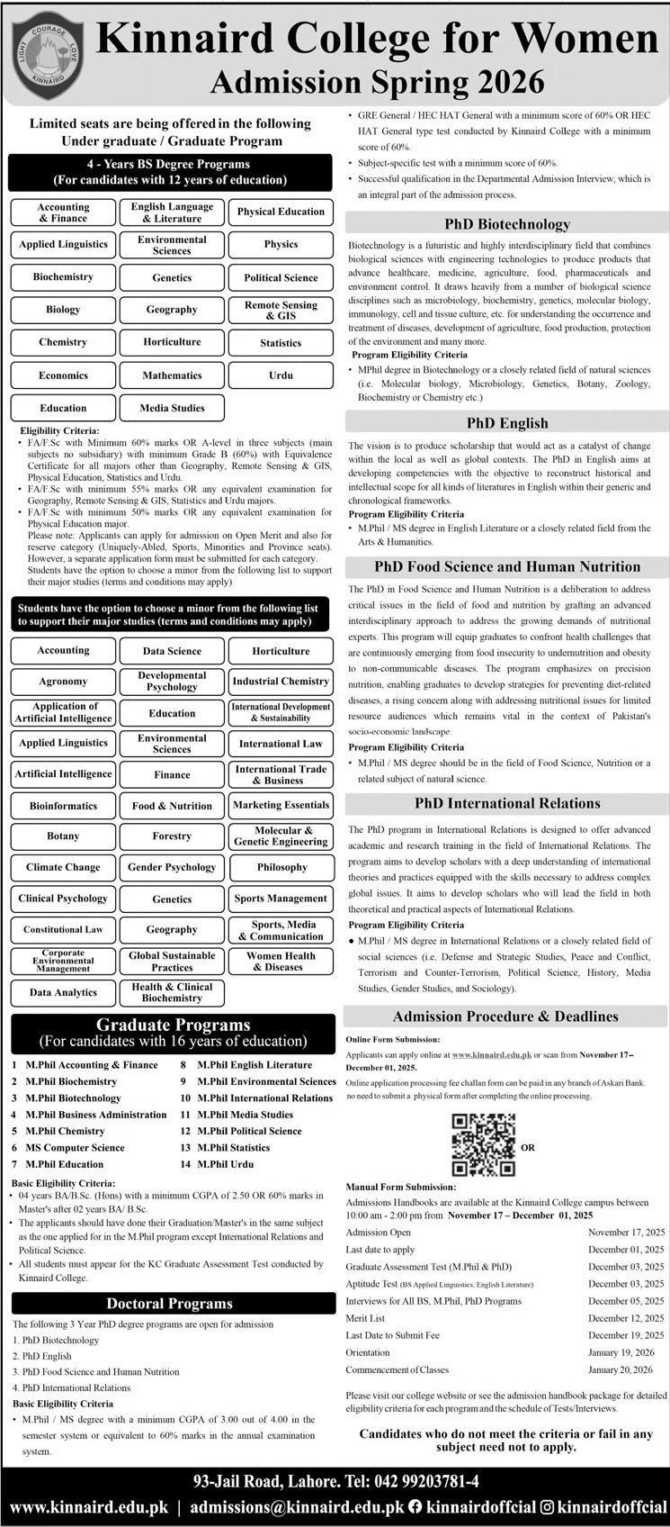 Admission Open in Kinnaird College For Women 2025 announce the Contract career opportunities for the post of See Below Ad in Punjab, Lahore for the fresh and experienced candidates on Contract basis who have Check Advertisement degree. Posted date of this post is 16/11/2025 and the last date is 01/12/2025. if you are eligible for this job apply before due date.