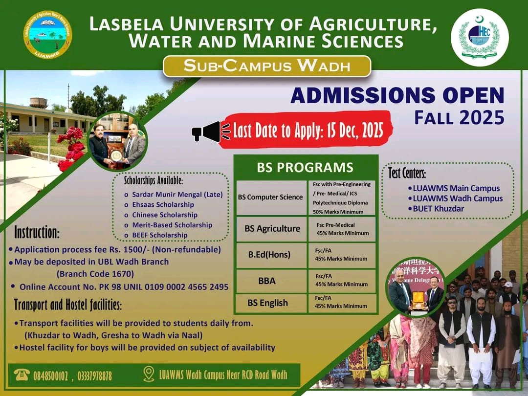 Lasbela University of Agriculture, Water & Marine Sciences (LUAWMS) Uthal announce the latest in different programs, details are mentioned in See Below Ad . Students from Balochistan, Bela and other provinces of Pakistan, can apply for the . Students awaiting for the s in Lasbela University of Agriculture, Water & Marine Sciences (LUAWMS) Uthal can apply according the given criteria which is mentioned in the advertisement. Students awaiting results may also apply. Advertisement date is 07/12/2025 and the last date of the admission is 15/12/2025
