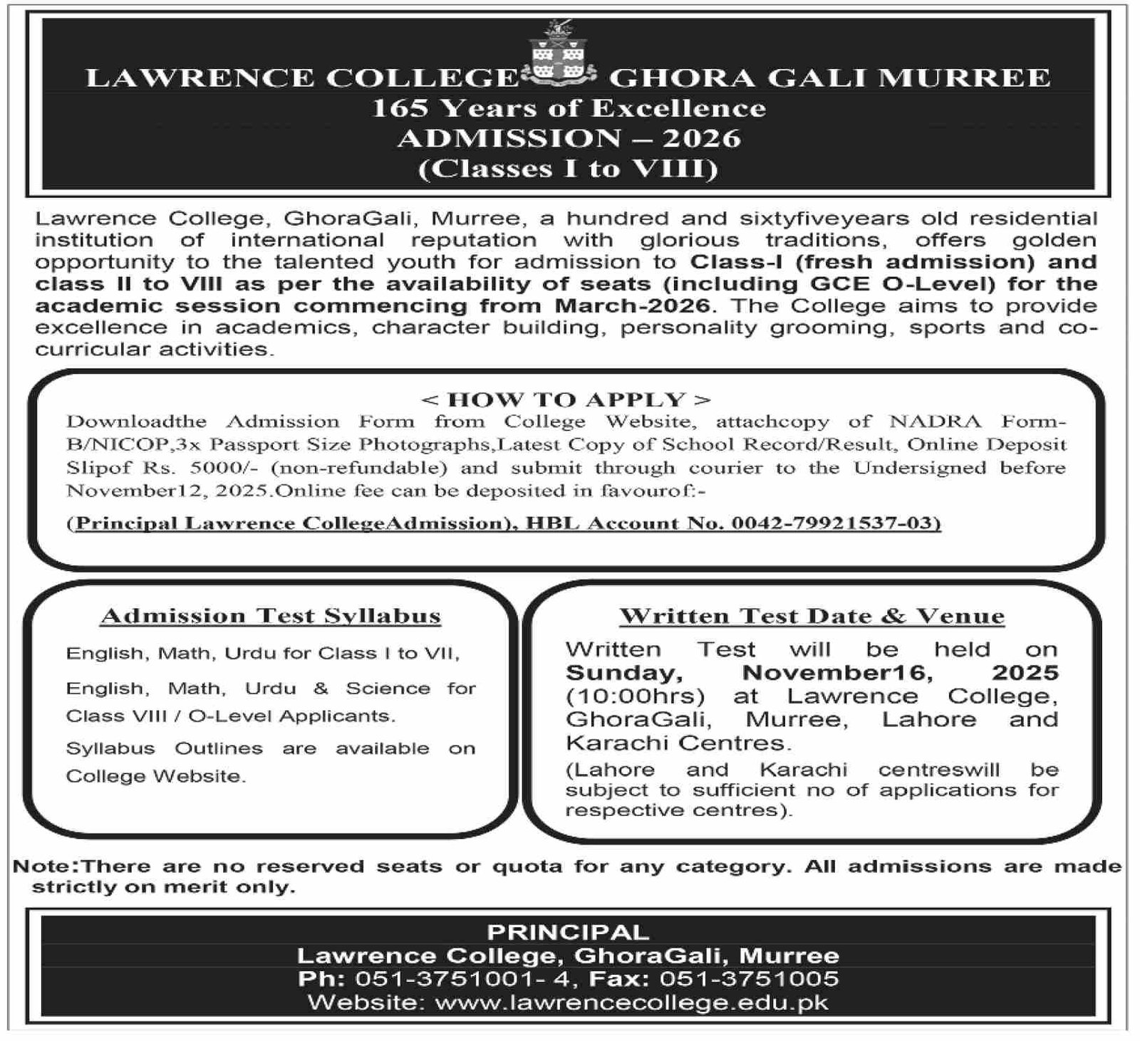 Lawrence College Ghora Gali announce the latest Admission in different programs, details are mentioned in See Below Ad . Students from Punjab, Murree and other provinces of Pakistan, can apply for the Admission. Students awaiting for the Admissions in Lawrence College Ghora Gali can apply according the given criteria which is mentioned in the advertisement. Students awaiting results may also apply. Advertisement date is 24/10/2025 and the last date of the admission is 16/11/2025