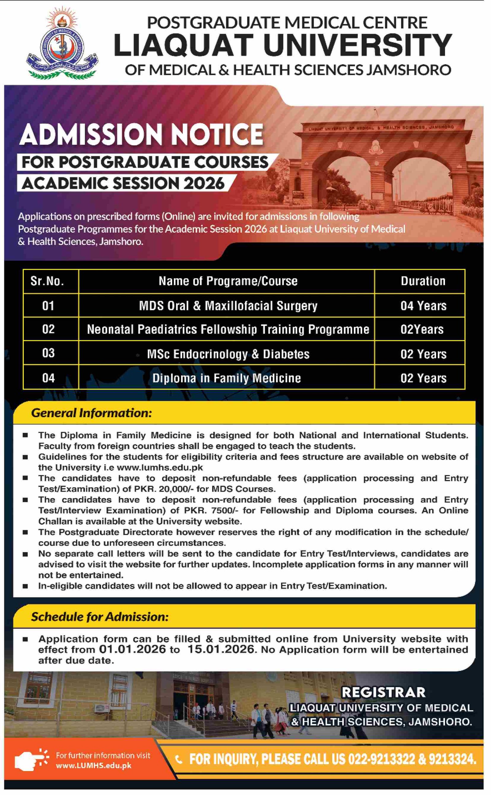 Liaquat University of Medical & Health Sciences (LUMHS) Jamshoro announce the latest in different programs, details are mentioned in See Below Ad . Students from Sindh, Jamshoro and other provinces of Pakistan, can apply for the . Students awaiting for the s in Liaquat University of Medical & Health Sciences (LUMHS) Jamshoro can apply according the given criteria which is mentioned in the advertisement. Students awaiting results may also apply. Advertisement date is 30/12/2025 and the last date of the admission is 01/01/2026