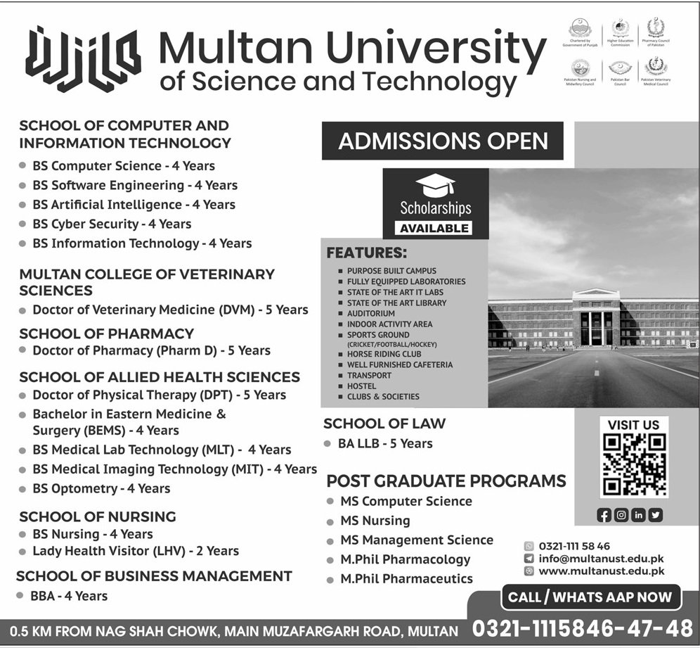 Multan University Of Science & Technology announce the latest in different programs, details are mentioned in See Below Ad . Students from Punjab, Multan and other provinces of Pakistan, can apply for the . Students awaiting for the s in Multan University Of Science & Technology can apply according the given criteria which is mentioned in the advertisement. Students awaiting results may also apply. Advertisement date is 05/10/2025 and the last date of the admission is 28/10/2025