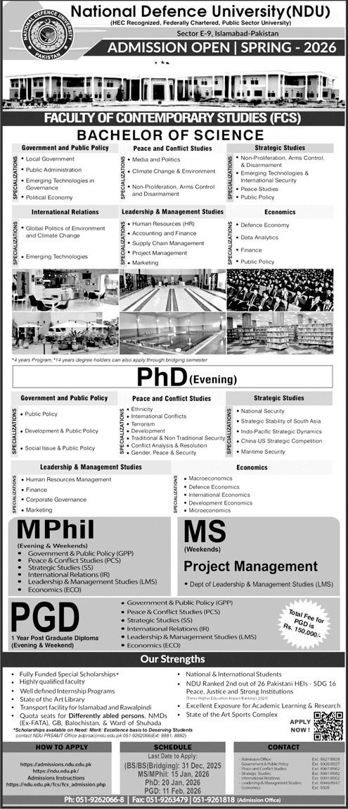 National Defence University, Pakistan announce the latest in different programs, details are mentioned in See Below Ad . Students from Federal, Islamabad and other provinces of Pakistan, can apply for the . Students awaiting for the s in National Defence University, Pakistan can apply according the given criteria which is mentioned in the advertisement. Students awaiting results may also apply. Advertisement date is 23/11/2025 and the last date of the admission is 31/12/2025