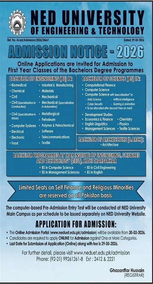 NED University of Engineering and Technology announce the latest Admission in different programs, details are mentioned in See Below Ad . Students from Malaysia, Karachi and other provinces of Pakistan, can apply for the Admission. Students awaiting for the Admissions in NED University of Engineering and Technology can apply according the given criteria which is mentioned in the advertisement. Students awaiting results may also apply. Advertisement date is 29/03/2026 and the last date of the admission is 29/05/2026