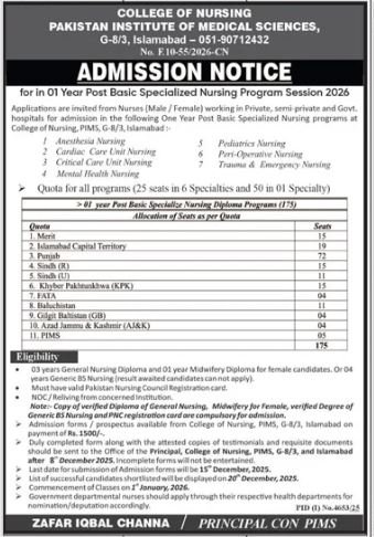 Pakistan Institute of Medical Sciences PIMS Islamabad announce the latest Admission in different programs, details are mentioned in See Below Ad . Students from Federal, Islamabad and other provinces of Pakistan, can apply for the Admission. Students awaiting for the Admissions in Pakistan Institute of Medical Sciences PIMS Islamabad can apply according the given criteria which is mentioned in the advertisement. Students awaiting results may also apply. Advertisement date is 06/12/2025 and the last date of the admission is 01/01/2026