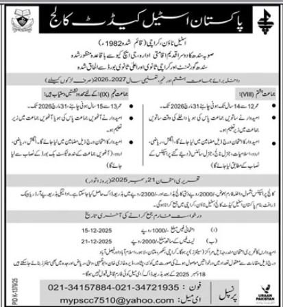 Pakistan Steel Cadet College announce the latest in different programs, details are mentioned in See Below Ad . Students from Sindh, Karachi and other provinces of Pakistan, can apply for the . Students awaiting for the s in Pakistan Steel Cadet College can apply according the given criteria which is mentioned in the advertisement. Students awaiting results may also apply. Advertisement date is 26/10/2025 and the last date of the admission is 21/12/2025
