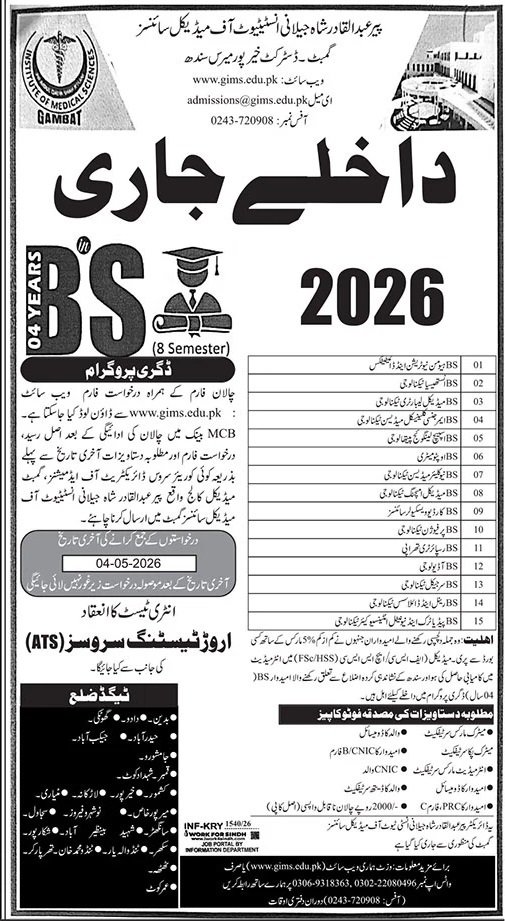 Admission Open in Pir Abdul Qadir Jalani Institue of Medical announce the Contract career opportunities for the post of See Below Ad in Sindh, Karachi for the fresh and experienced candidates on Contract basis who have Check Advertisement degree. Posted date of this post is 29/04/2026 and the last date is 04/05/2026. if you are eligible for this job apply before due date.