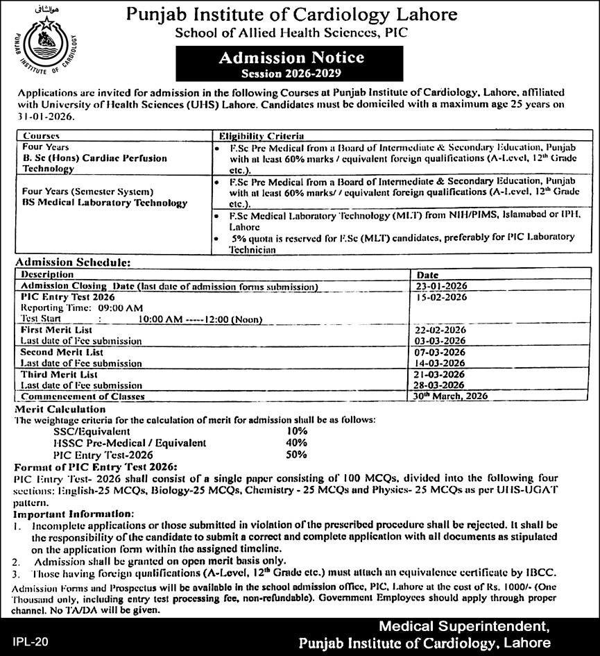 Admission Open in Punjab Institue of Cardiology Lahore 2026 announce the Contract career opportunities for the post of See Below Ad in Punjab, Lahore for the fresh and experienced candidates on Contract basis who have Check Advertisement degree. Posted date of this post is 03/01/2026 and the last date is 14/03/2026. if you are eligible for this job apply before due date.