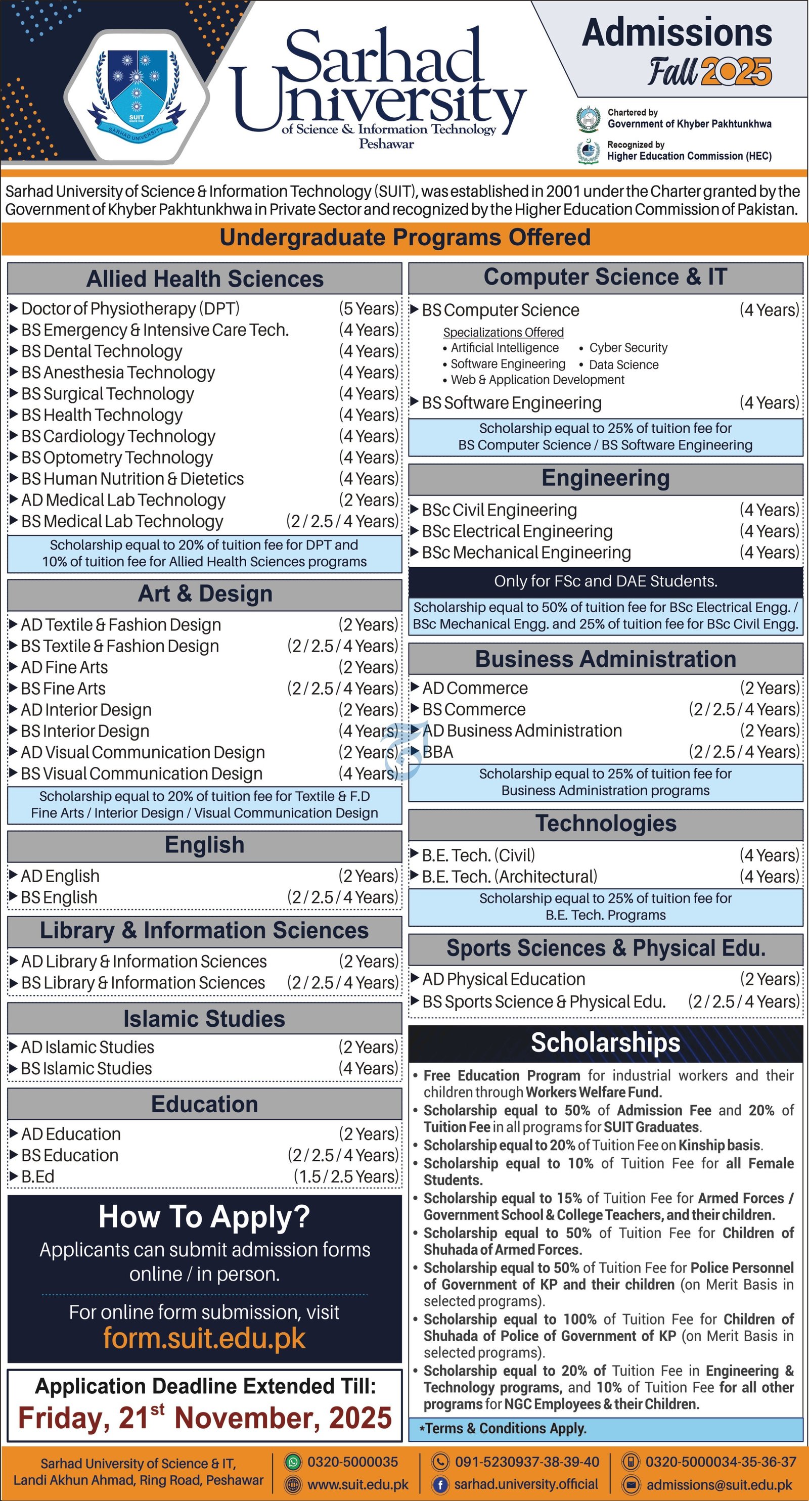 Admission Open in Sarhad University of Science & information announce the Contract career opportunities for the post of See Below Ad in Khyber Pakhtunkhwa, Peshawar for the fresh and experienced candidates on Contract basis who have Check Advertisement degree. Posted date of this post is 19/11/2025 and the last date is 21/11/2025. if you are eligible for this job apply before due date.