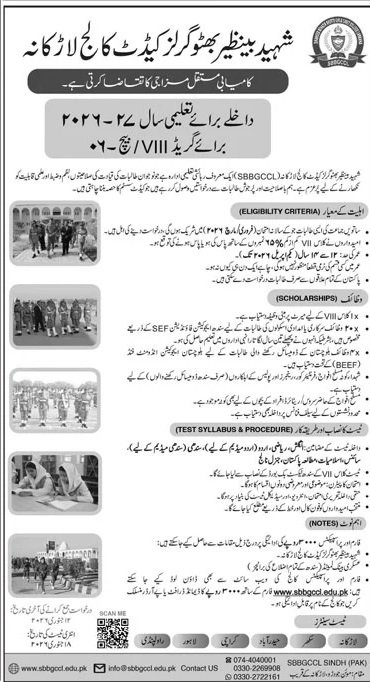 Shaheed Benazir Bhutto Girls Cadet College Larkana announce the latest in different programs, details are mentioned in See Below Ad . Students from Sindh, Larkana and other provinces of Pakistan, can apply for the . Students awaiting for the s in Shaheed Benazir Bhutto Girls Cadet College Larkana can apply according the given criteria which is mentioned in the advertisement. Students awaiting results may also apply. Advertisement date is 23/11/2025 and the last date of the admission is 12/01/2026