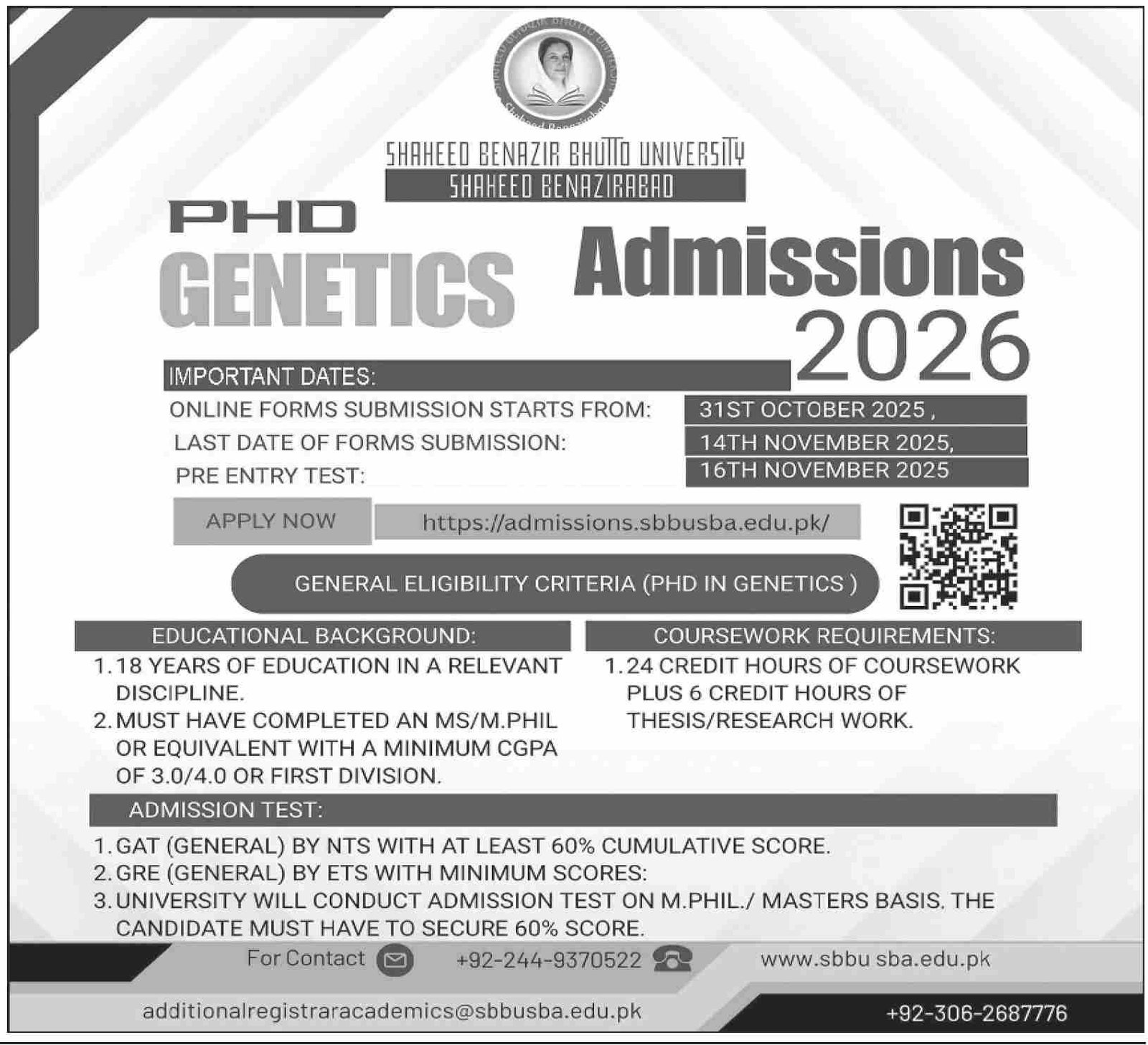 Shaheed Benazir Bhutto University Shaheed Benazirabad announce the latest in different programs, details are mentioned in See Below Ad . Students from Sindh, Shaheed Benazirabad and other provinces of Pakistan, can apply for the . Students awaiting for the s in Shaheed Benazir Bhutto University Shaheed Benazirabad can apply according the given criteria which is mentioned in the advertisement. Students awaiting results may also apply. Advertisement date is 31/10/2025 and the last date of the admission is 14/11/2025