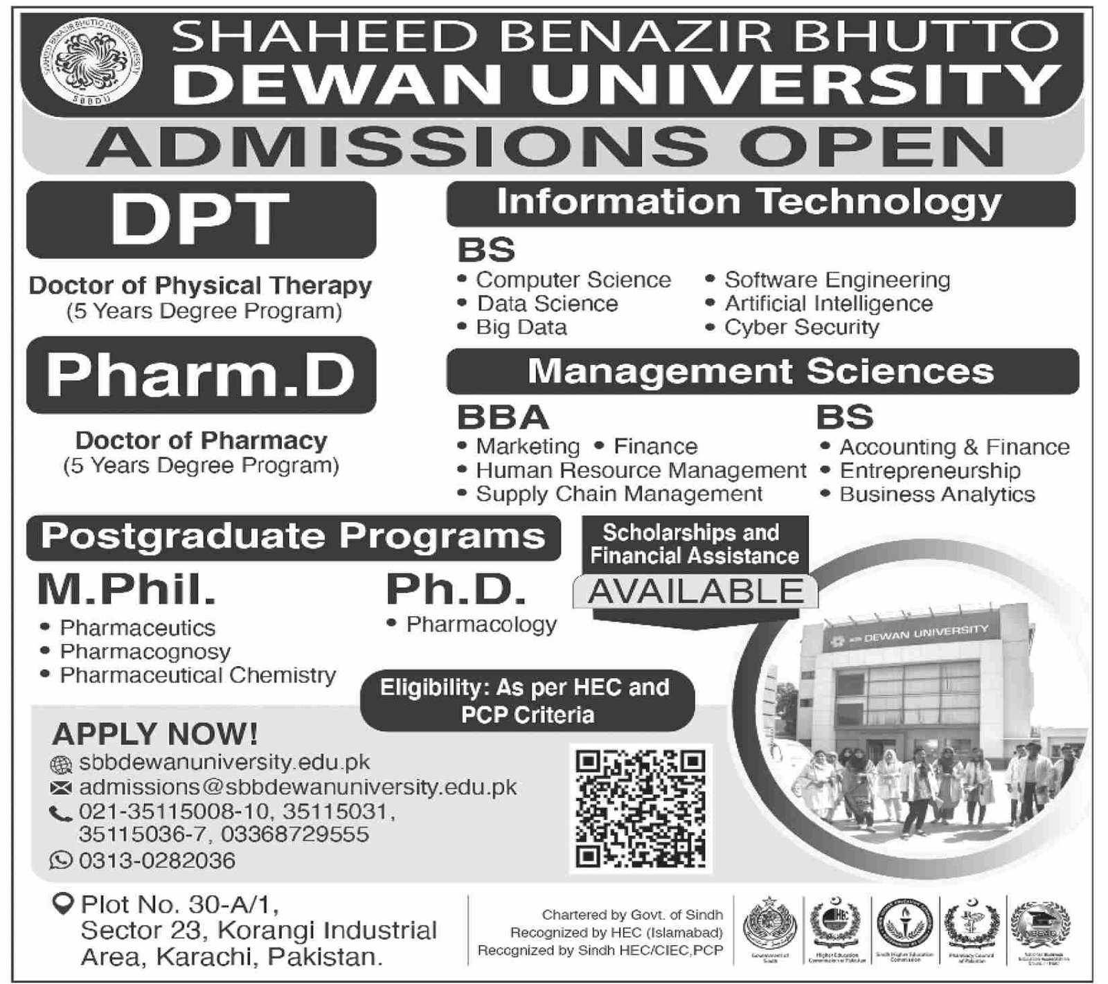 Shaheed Benazir Bhutto Dewan University announce the latest in different programs, details are mentioned in See Below Ad . Students from Sindh, Karachi and other provinces of Pakistan, can apply for the . Students awaiting for the s in Shaheed Benazir Bhutto Dewan University can apply according the given criteria which is mentioned in the advertisement. Students awaiting results may also apply. Advertisement date is 12/10/2025 and the last date of the admission is 31/10/2025