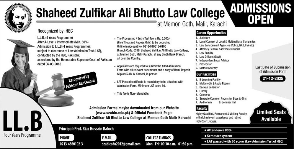 Shaheed Zulfiqar Ali Bhutto University of Law Karachi announce the latest in different programs, details are mentioned in See Below Ad . Students from Sindh, Karachi and other provinces of Pakistan, can apply for the . Students awaiting for the s in Shaheed Zulfiqar Ali Bhutto University of Law Karachi can apply according the given criteria which is mentioned in the advertisement. Students awaiting results may also apply. Advertisement date is 30/11/2025 and the last date of the admission is 21/12/2025
