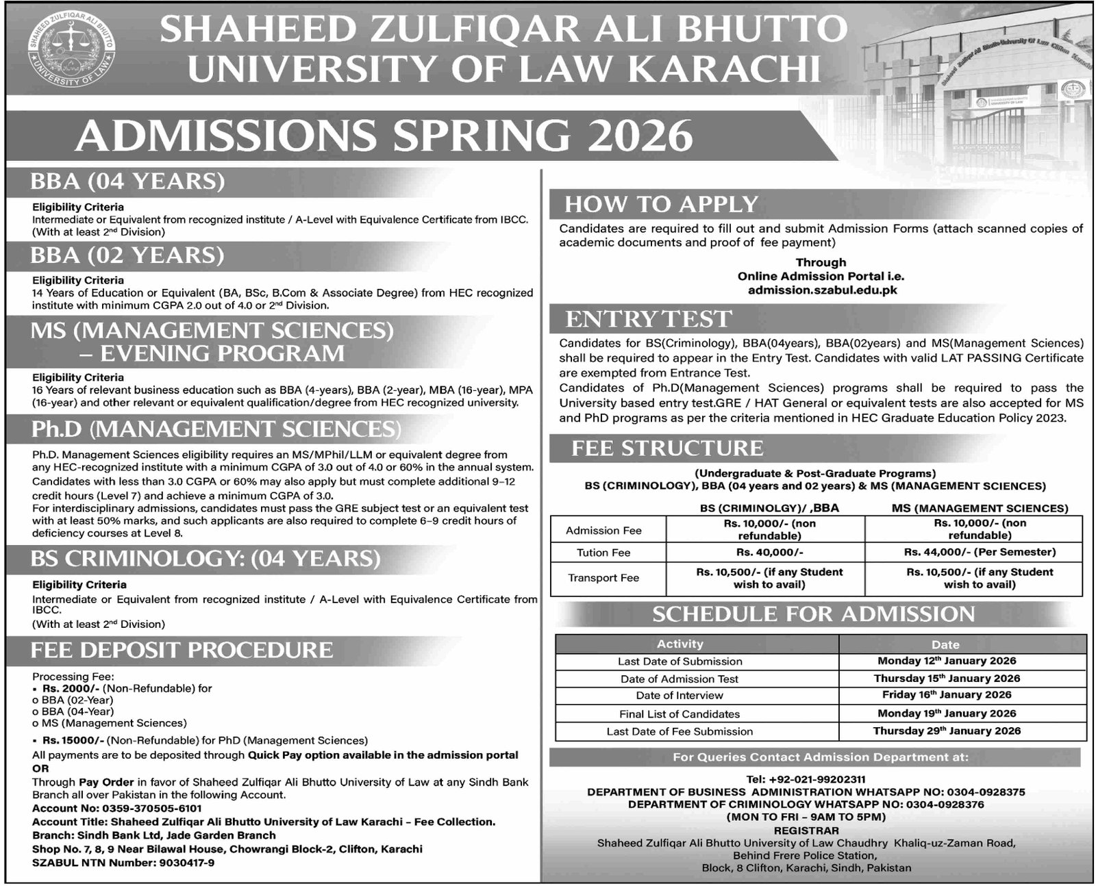 Shaheed Zulfiqar Ali Bhutto University of Law Karachi announce the latest in different programs, details are mentioned in See Below Ad . Students from Sindh, Karachi and other provinces of Pakistan, can apply for the . Students awaiting for the s in Shaheed Zulfiqar Ali Bhutto University of Law Karachi can apply according the given criteria which is mentioned in the advertisement. Students awaiting results may also apply. Advertisement date is 28/12/2025 and the last date of the admission is 12/01/2026
