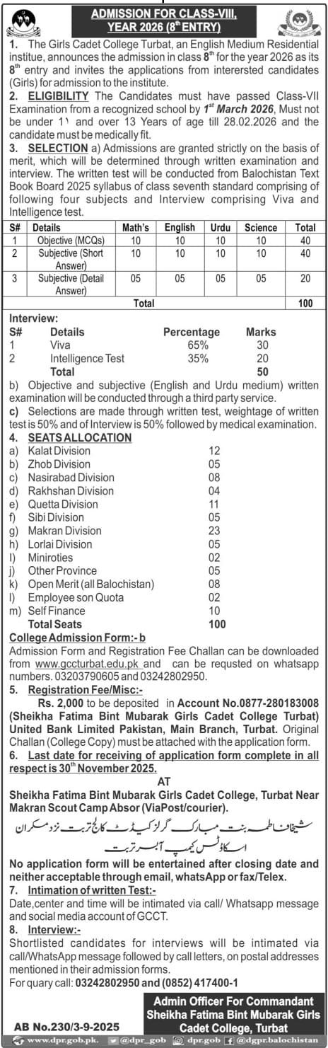 Sheikha Fatima Bint Mubarak Girls Cadet College Turbat announce the latest in different programs, details are mentioned in See Below Ad . Students from Balochistan, Turbat and other provinces of Pakistan, can apply for the . Students awaiting for the s in Sheikha Fatima Bint Mubarak Girls Cadet College Turbat can apply according the given criteria which is mentioned in the advertisement. Students awaiting results may also apply. Advertisement date is 04/09/2025 and the last date of the admission is 30/11/2025