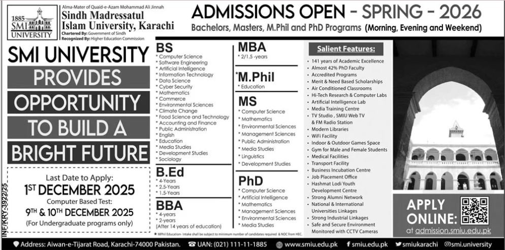 Sindh Madressatul Islam University Karachi announce the latest Admission in different programs, details are mentioned in See Below Ad . Students from Sindh, Karachi and other provinces of Pakistan, can apply for the Admission. Students awaiting for the Admissions in Sindh Madressatul Islam University Karachi can apply according the given criteria which is mentioned in the advertisement. Students awaiting results may also apply. Advertisement date is 23/11/2025 and the last date of the admission is 01/12/2025
