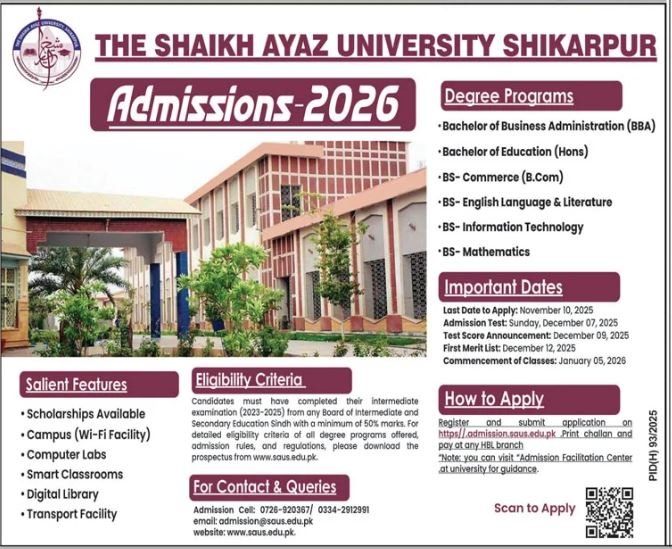 Admission Open in The Sheokha Ayaz University Shikapur 2025 announce the Contract career opportunities for the post of See Below Ad in Punjab, Sheikhupura for the fresh and experienced candidates on Contract basis who have Check Advertisement degree. Posted date of this post is 06/09/2025 and the last date is 12/09/2025. if you are eligible for this job apply before due date.