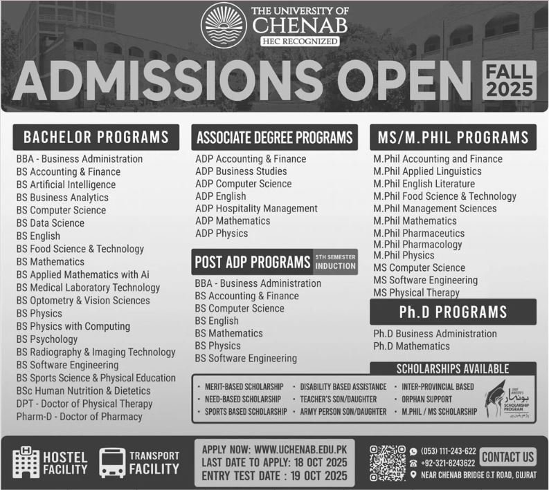 University of Chenab announce the latest in different programs, details are mentioned in See Below Ad . Students from Punjab and other provinces of Pakistan, can apply for the . Students awaiting for the s in University of Chenab can apply according the given criteria which is mentioned in the advertisement. Students awaiting results may also apply. Advertisement date is 12/10/2025 and the last date of the admission is 30/10/2025